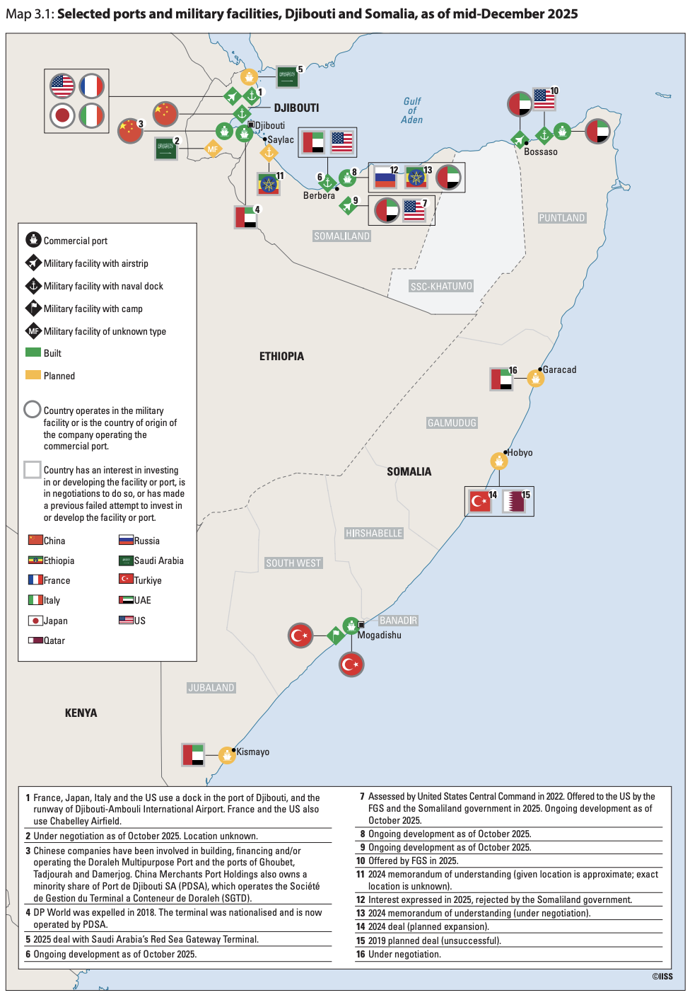 This map shows the location of selected ports and military facilities in Djibouti and Somalia. It breaks them down by country; operation vs interest; built vs planned; and commercial vs military, adding nuance and crucial detail that is often missed in ongoing conversations about port and basing access. It’s also part of a chapter I wrote on the competition for ports and bases for this report: Lawless Seas, Contested Shores - Piracy, Smuggling and the Scramble for Port Access in the Horn of Africa. The map was designed by the IISS design team.